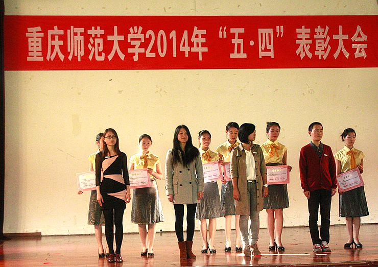 大会在雄壮的国歌声中拉开帷幕。在校领导宣读了各项表彰决定后,大会进入了颁奖环节。获得重庆市2012—2013学年度先进个人和先进集体表彰及重庆师范大学2013—2014学年度共青团系统优秀青年和青年群体表彰的学生代表依次上台领奖。我院2011级小学教育(语文)2班获得重庆市先进班集体称号,学生六舍6522寝室获得重庆市文明寝室称号;2012级小学教育(语文)二支部和2012级艺术教育(书法)一支部获得重庆师范大学五四红旗团支部称号;有6人被评为重庆市先进个人、218人次被评为重庆师范大学优秀共青团员、团干等。会上,大家用持续热烈的掌声表达了对获奖集体和个人的祝贺。大会最后,个人和集体获奖代表分别进行了热情的发言,呼吁广大青年学子发扬“五四”精神,坚定信念,奋发图强,时刻紧跟党的步伐,为做祖国和党的接班人时刻准备着。
