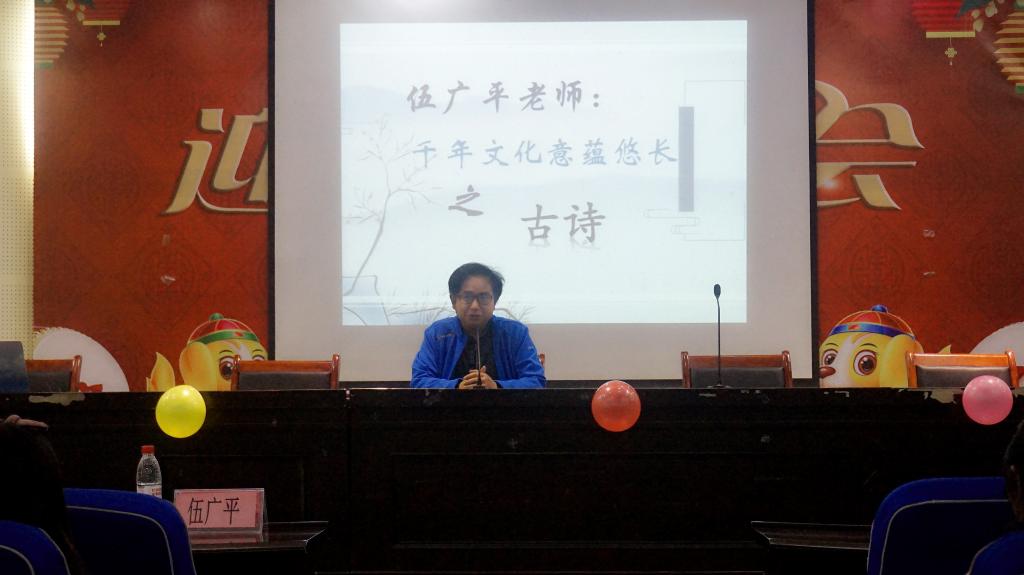 首先,伍广平老师从三个方面对于 “十年文化意韵悠长之古诗”这一主题进行了讲解。伊始,他谈到了诗歌的分类及诗歌的一些结构与形式;接着伍老师用自己的写诗经历来激励同学们培养作诗热情。他谈到:“生活中处处存在诗,看到一物一景时,同学们都可以通过写诗来表达内心的真实感受。这不仅可以丰富自己的文化生活,还能提升文学素养。”最后,他强调要想练就好的作诗文采就必须要在日常生活中养成良好的作诗习惯,并不断地尝试与练习。