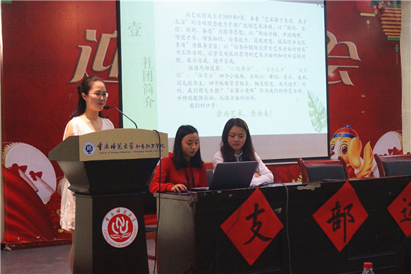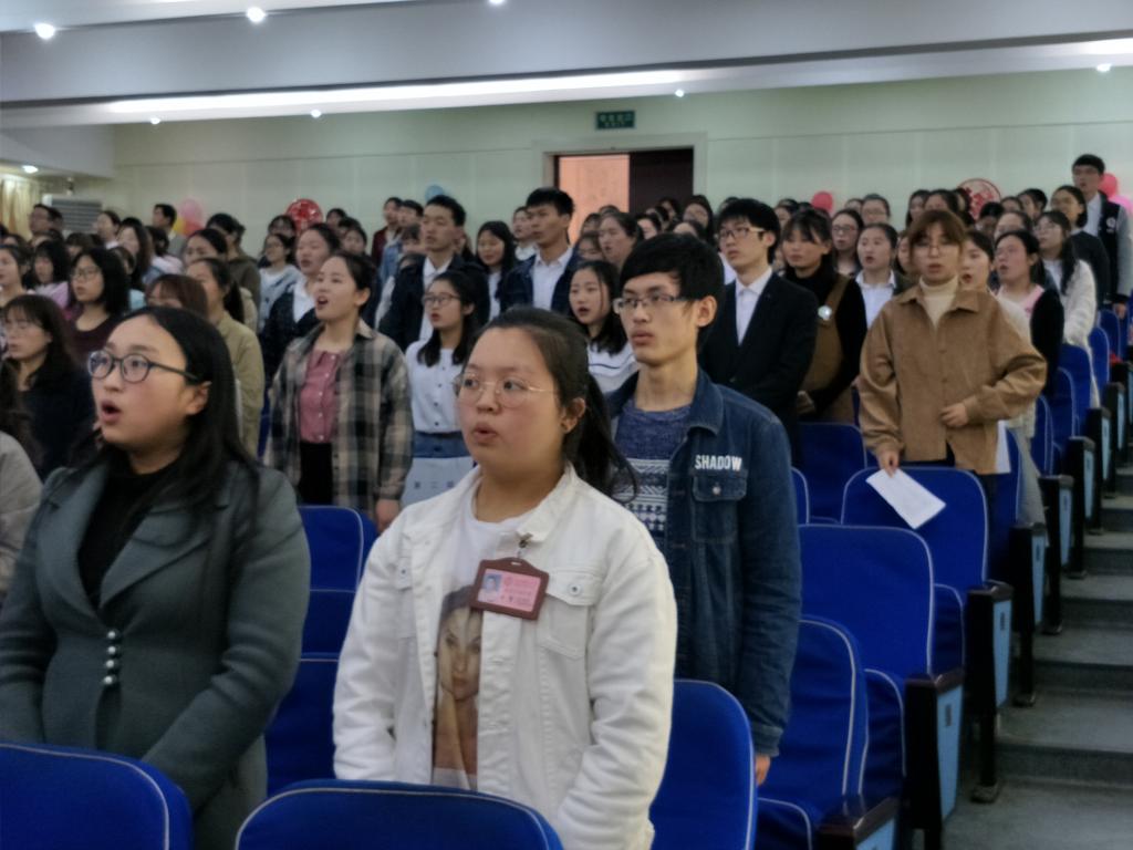 第一项是全体师生起立,齐唱《共青团之歌》,同学们用热情饱满的声音唱出了对祖国的热爱,唱出了青春与活力;第二项是各个支部的风采展示,各支部代表分别展示了自己支部在过去一年里所举办的各种活动以及所获的荣誉奖章,其中16全科第4支部用新闻联播的新颖方式介绍了自己支部的风采,他们谈到他们在过去的一年里积极响应国家对大学生创新创业的号召,开展了一系列有关创新创业的活动,体现了他们听党话、跟党走的思想。