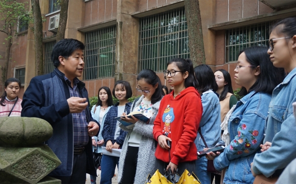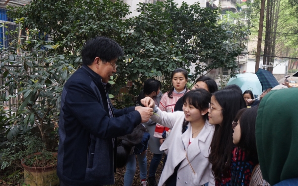 朦胧细雨,依旧阻止不了张老师和同学们的热情。张老师首先从基本信息、药用价值及可食用性向同学们介绍了三教楼门前的银杏树;腊梅和黄桷兰是校园内常见的植物,其种植方式却蕴含着不少知识,张老师向同学们讲解了腊梅需要压条繁殖的原因以及不同类型的压条方式以及黄桷兰雄蕊雌蕊分裂的相关知识;在到达下一个目的地之前,张老师还向同学们介绍了自己从家乡带来培植的红豆杉。初教院的这棵红豆杉已经有三十岁了,虽然不似其他树木那么高大伟岸,但却是国家一级保护植物。因为红豆杉所含的高药用价值,导致红豆杉曾被大量砍伐,因此张老师呼吁同学们提高保护植物的意识;课程最后,张老师向同学们介绍了学员所种植的各种植物:虎耳草、天竺葵、刺桐······上课的过程中,同学们十分积极地向张老师请教,提出自己的疑惑,阴雨连绵,张老师与大家的互动依旧进行,丝毫不受影响。
